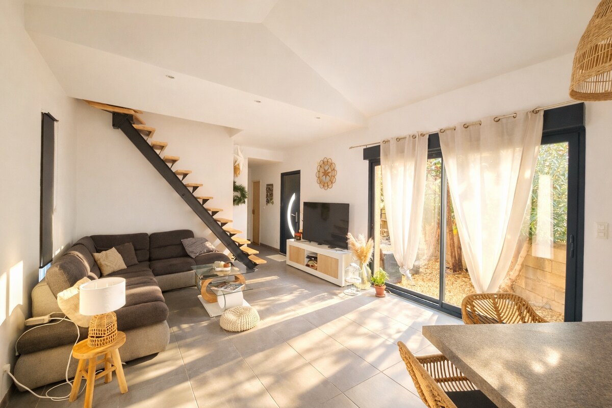Prenez quelques jours de repos dans cette élégante maison décorée avec goût et chaleureuse. Vous avez une terrasse extérieure ou vous pourrez profiter du calme. Le logement fournit les draps et serviettes de toilette. Vous êtes à 3 mn à pied du canal du midi, pour pouvoir pleinement vous ressourcer. A 10 mn à pied de la clinique Causse, du centre et du charmant port . Village entre Narbonne et Béziers. A 20 mn de la plage, 1h30 de l'Espagne. Villes les plus proches Beziers et Narbonne.
