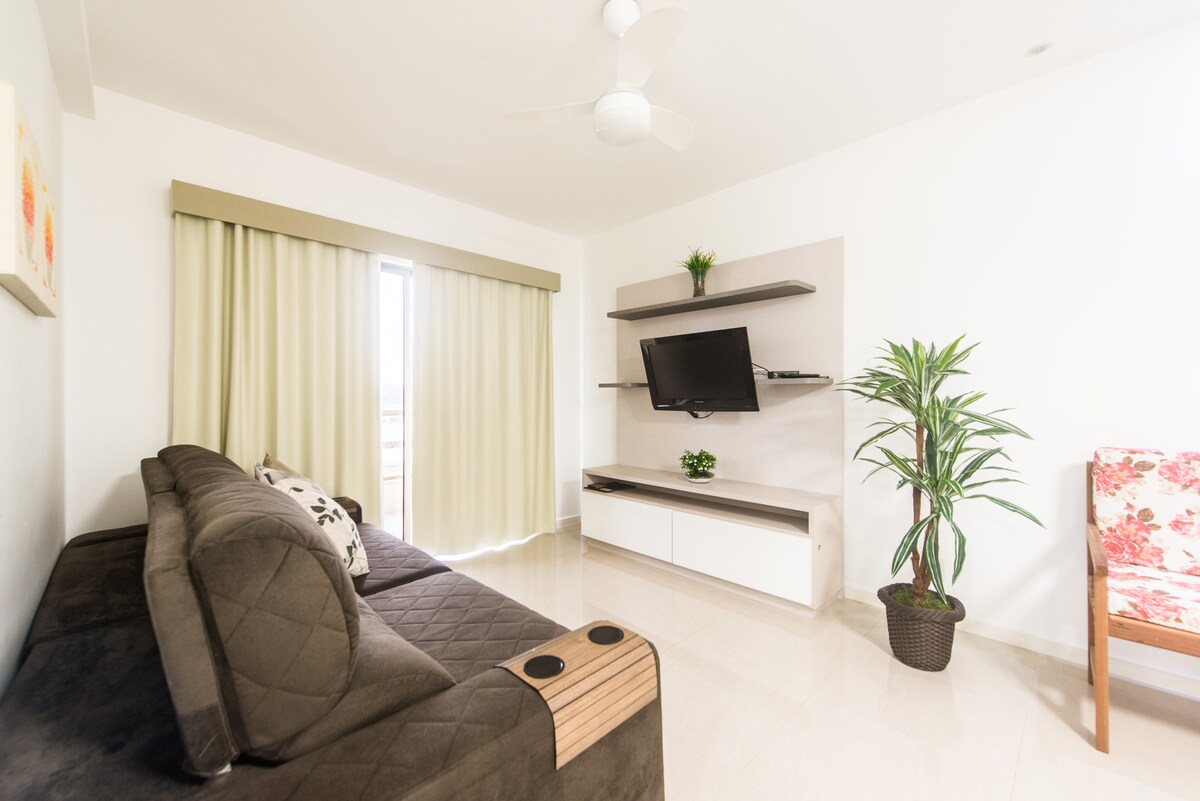 Profitez d'Arraial do Cabo dans cet appartement confortable à Praia Grande. Il dispose d'une suite avec un lit double et d'une chambre avec deux lits superposés, toutes deux avec climatisation. Salle de bain commune, cuisine équipée, salon avec canapé-lit, Wi-Fi et Smart TV. Linge de lit et de toilette complet. Espace de loisirs sur le toit avec piscine, barbecue, salle de sport et vue imprenable. 1 place de parking, concierge 24h/24, à seulement 5 minutes à pied du front de mer et à quelques pas de la mer.