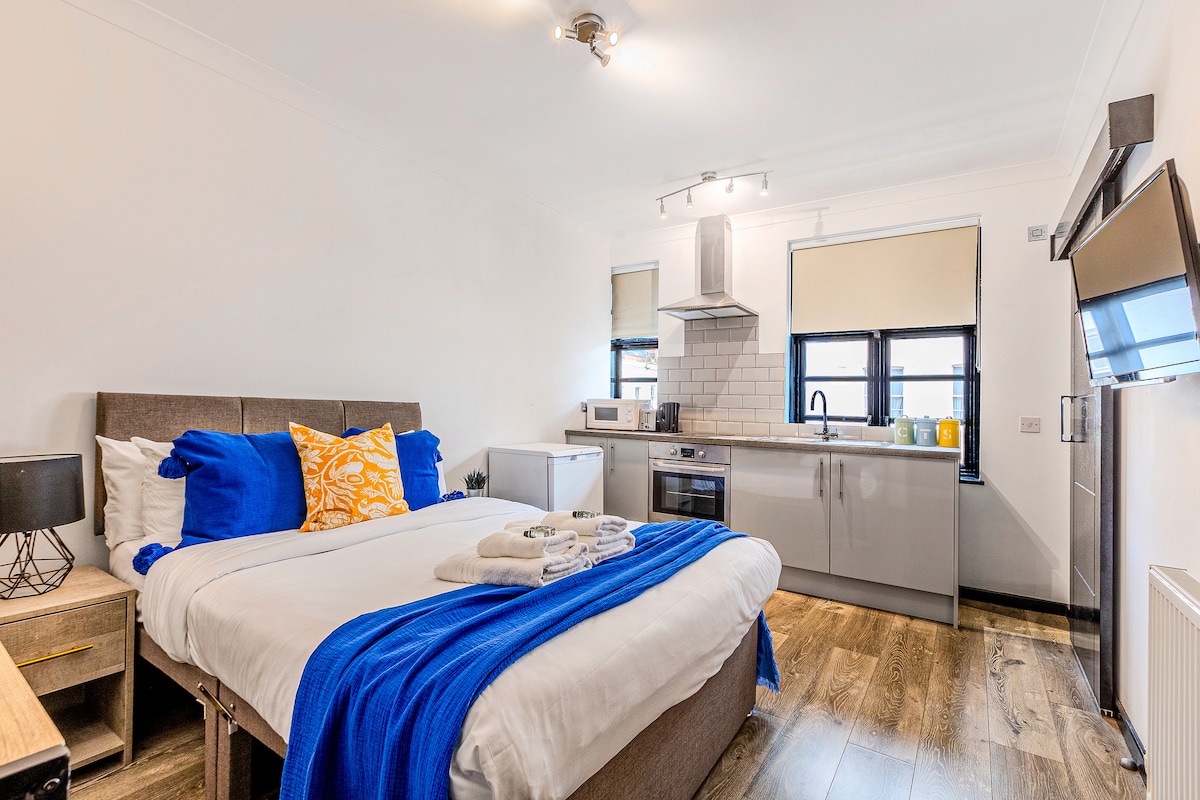 Grande chambre avec salon ouvert. Lit King Size européen de luxe NaturalMat (identique aux hôtels Six Senses) (160 cm x 200 cm). Salle de bain avec baignoire et douche et articles de toilette écologiques fournis. Cuisine entièrement équipée – Machine à café, ustensiles de cuisine Joseph Joseph, cuisinière à gaz à 4 feux, lave-vaisselle, réfrigérateur-congélateur de grande taille Télévision connectée et refroidissement confortable – Pour un confort et un divertissement tout au long de l'année. Concierge en semaine et ascenseur à tous les étages. Nous sommes également le premier opérateur durable de Londres !