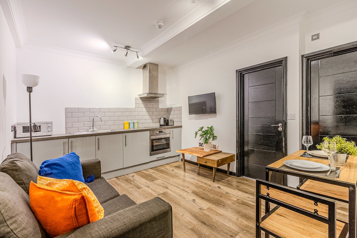 Grande chambre avec salon ouvert. Lit King Size européen de luxe NaturalMat (identique aux hôtels Six Senses) (160 cm x 200 cm). Salle de bain avec baignoire et douche et articles de toilette écologiques fournis. Cuisine entièrement équipée – Machine à café, ustensiles de cuisine Joseph Joseph, cuisinière à gaz à 4 feux, lave-vaisselle, réfrigérateur-congélateur de grande taille Télévision connectée et refroidissement confortable – Pour un confort et un divertissement tout au long de l'année. Concierge en semaine et ascenseur à tous les étages. Nous sommes également le premier opérateur durable de Londres !