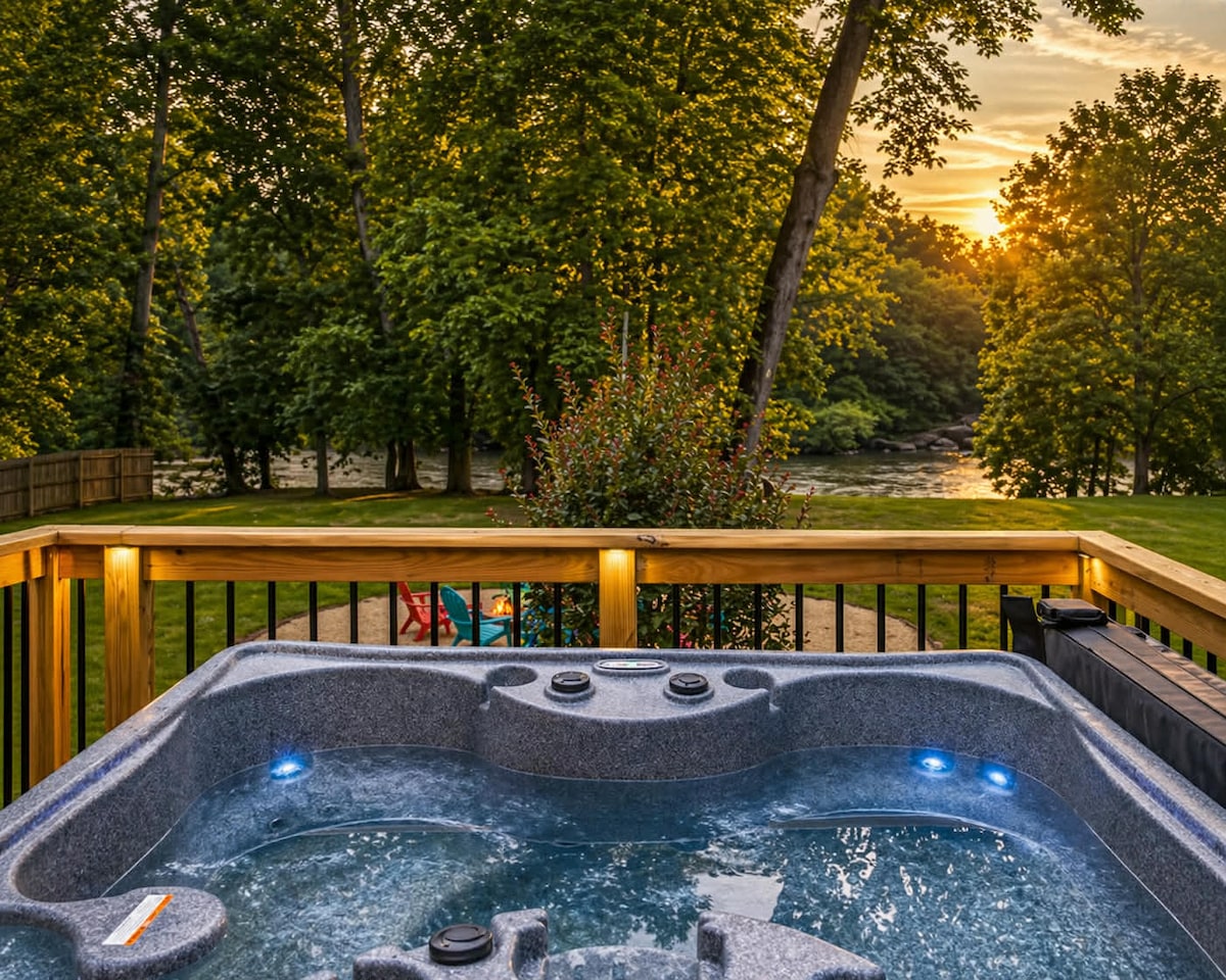 Cabane moderne au bord de la rivière avec jacuzzi, feu de camp, kayaks
