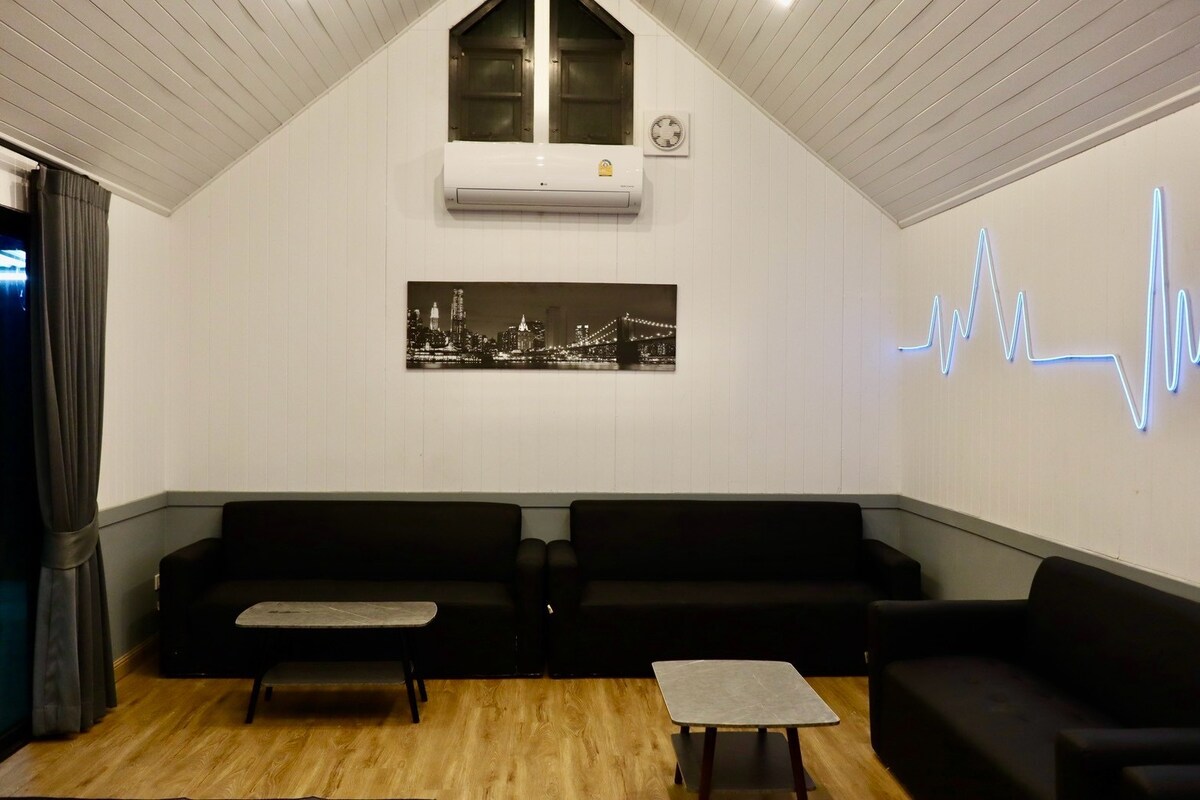 Bon pour 4 personnes sans frais supplémentaires. Nous avons fourni un poêle à barbecue et de l'équipement. Notre maison de style unique avec un toit en plein air. Vous pouvez voir le coucher et le lever du soleil depuis le toit. 2 lits. Grande TV. 1 salle de bain. Coin cuisine avec table à manger et lave-linge. Une maison de 2 étages. Vous aurez accès à toute la maison. Meilleur emplacement. Marché frais, chocolaterie, 7-11, PALIO. Mon logement est très proche du parc national de Khao Yai (à 10 minutes de l'entrée).