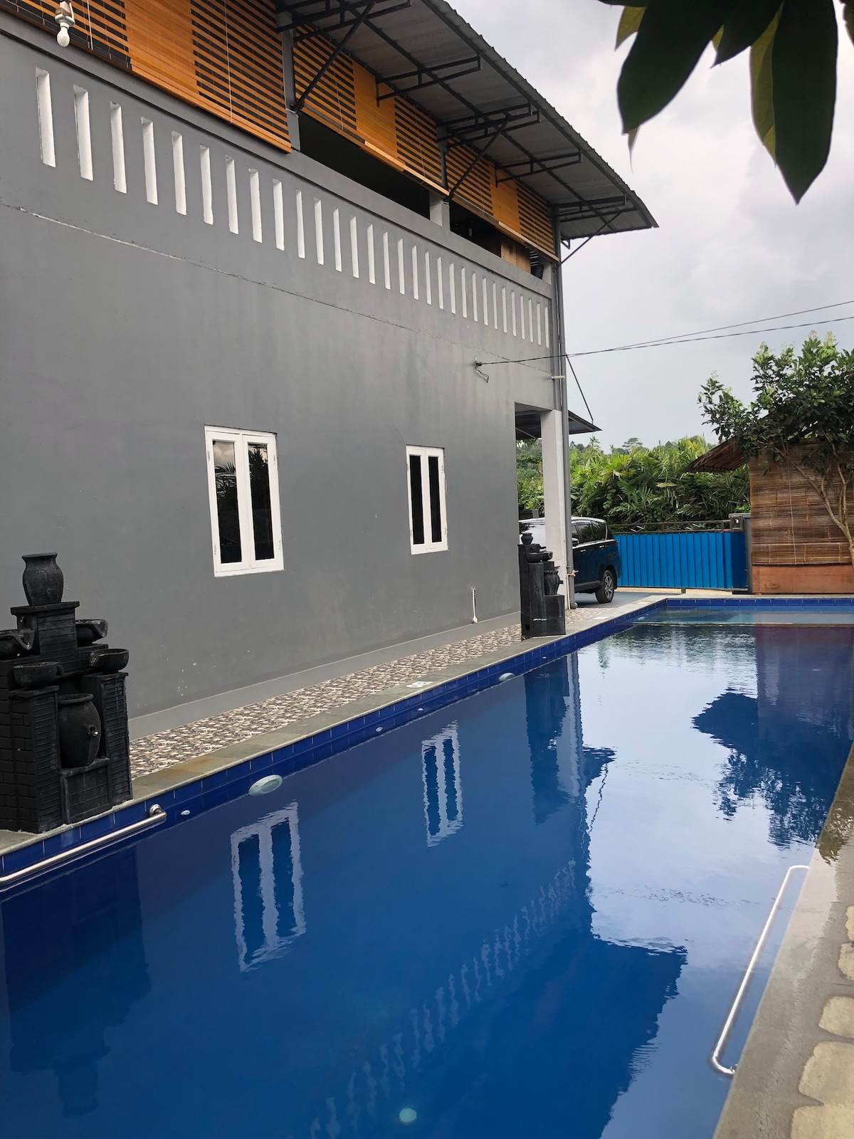 Détendez-vous, détendez-vous ou même travaillez. Cette petite villa est un lieu pour tous. Niché aux pieds du mont Salak avec vue sur le mont Pangrango et notre propre jardin. Votre solution pour une courte escapade loin de l'agitation de la ville, à 70 minutes de Jakarta. *Fasilitas :* 1. Piscine (vue semblable à Ubud) 2. Balcon (Gunung Pangrango + Sunrise View) 3. Jeux de société (catur, uno, stacko, etc.) 4. TV Netflix Youtube 5. Wifi jusqu'à 5 Mbit/s 6. Jardins 7. Cuisine 8. Terrasse d'observation