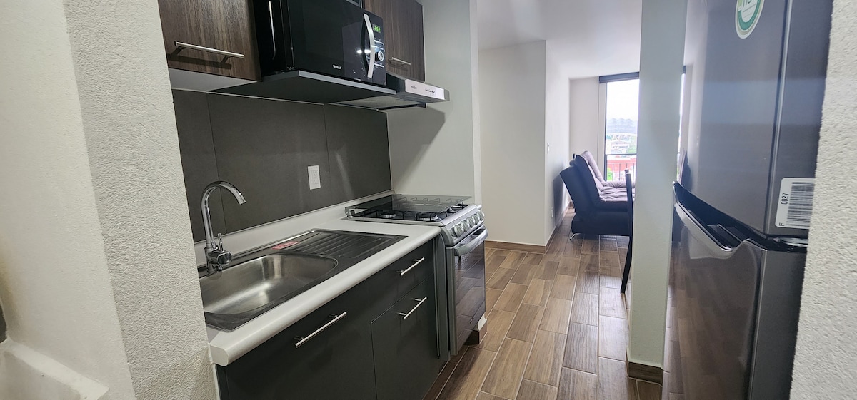 Profitez d'un espace moderne, confortable et très bien situé. À seulement 15 minutes de l'aéroport et très proche du stade GNP, du Palais des Sports, à 15 minutes de l'aéroport AICM, du métro et du métrobus. Idéal pour assister à des concerts, des événements ou des congrès. L'appartement dispose de 2 chambres spacieuses, salon-salle à manger, café, thé et cuisine équipée. Le bâtiment dispose d'une salle de sport, d'une sécurité 24 h/24 et 7 j/7 et d'ascenseurs. Parfait pour un séjour pratique et détendu ! Bénéficie de 10 % de réduction avec la politique non remboursable.