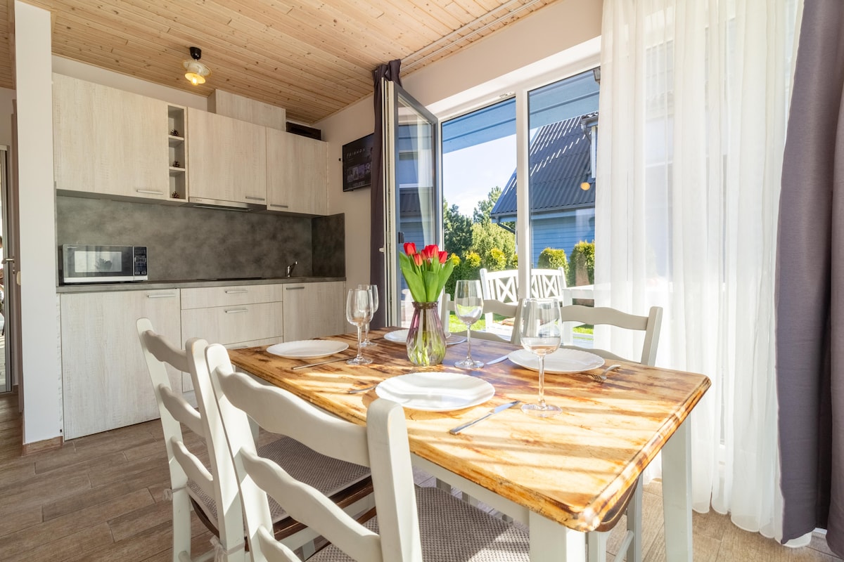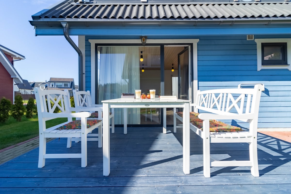 Une nouvelle maison de vacances ensoleillée avec terrasse privée est située dans un quartier calme. Dans la maison, vous trouverez deux chambres au deuxième étage, une salle de bain, un salon et une cuisine avec tout ce dont vous pourriez avoir besoin pour cuisiner au premier étage. La terrasse romantique confortable où vous pourrez passer des soirées en famille et profiter d'un dîner cuisiné sur le barbecue. La maison se trouve à quelques minutes du bord de mer calme et propre, de sorte que vous pourrez entendre le bruit des vagues de mer.