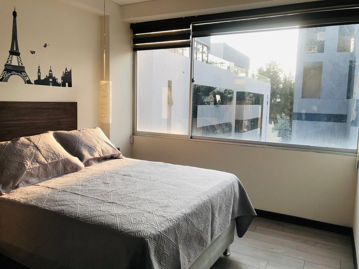 Appartement agréable et confortable dans la Barqueta de Achumani, l'une des zones les plus calmes de la ville, idéal pour se détendre et avoir un bon repos. Design moderne, avec deux terrasses et belle vue. Il dispose d'une cuisine équipée, d'une machine à laver, d'une télévision 43", d'un lit double et d'une connexion Internet haut débit. Il est proche des pharmacies, des supermarchés, des transports, des restaurants, etc. Faites une pause et profitez de votre séjour dans cet espace confortable.