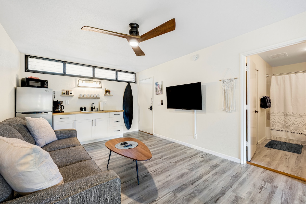 Votre beau camp de base pour l'aventure vous attend ! Suite d'hôtes entièrement équipée et récemment rénovée au-dessus du garage de notre maison familiale. Lanai privé, vue sur l'océan, vélos, kayak, SUP et planche de surf inclus dans votre location. Unité lumineuse et aérée avec de magnifiques plafonds voûtés, des draps blancs frais, un matelas à plateau-coussin et du café pour démarrer votre matinée. Nous avons tout ce dont vous avez besoin pour explorer cette île magique - récemment présentée dans Condé Nast comme l'un des meilleurs Airbnbs d'Hawaï !