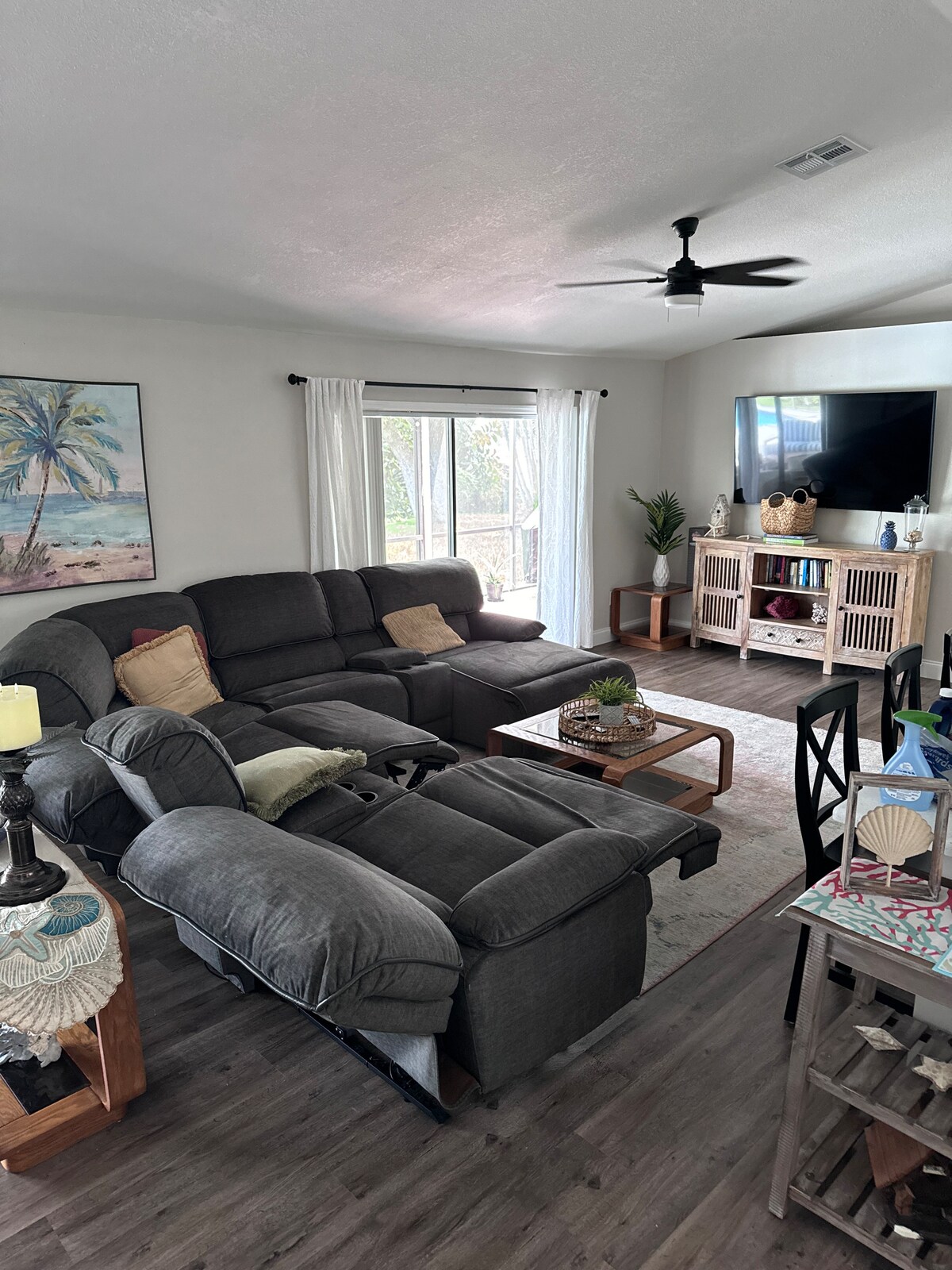Découvrez la retraite ultime à Palm Bay, FL. Notre maison de 3 chambres et 2 salles de bains, à seulement une heure d'Orlando, offre confort et divertissement. Une salle de cinéma privée avec un téléviseur HD de 85 pouces (garage aménagé). Défiez vos amis avec des jeux de billard, air hockey, ping-pong et baby-foot, ou détendez-vous sur la cour pour un délicieux dîner en plein air. Ce havre assure un séjour mémorable, avec d'innombrables options de divertissement. Bienvenue!