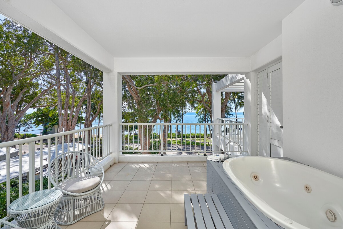 Ce magnifique appartement d'une chambre au fond du complexe hôtelier se trouve à seulement 50 pas de la plage. Vous pourrez vous promener le long de l'esplanade et vous imprégner de l'atmosphère du village cosmopolite, dîner dans certains des meilleurs restaurants du Queensland, déguster un cocktail (ou deux) dans l'un des NOMBREUX bars de l'esplanade tout en jetant un œil sur la mer de corail et en réfléchissant à ce que vous aimez ici... Vous devez être ici pour comprendre à quel point cet endroit est relaxant... Veuillez noter que le complexe hôtelier est un espace non-fumeur.