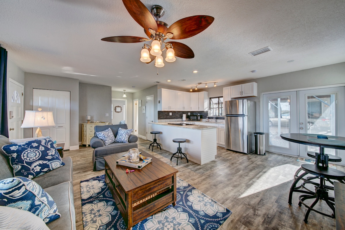 Délicieux et confortable 2 lits/2 salles de bain/cuisine et salon/salle à manger combinés intentionnellement conçus pour un séjour de détente. 1 chambre avec lit King size et 1 chambre avec lit Queen size, avec matelas et literie haut de gamme. Canapé-lit Queen Size dans le salon, 1 lit pliant pour un enfant et 1 lit parapluie. Téléviseurs 4K dans toutes les chambres, Internet haut débit. Porche avant et porche arrière grillagé. Cuisine entièrement équipée. 12-15 min à pied de la plage (4 min en voiture et parking facile) 30 min du centre spatial Kennedy, 60 min d'Orlando et des parcs à thème