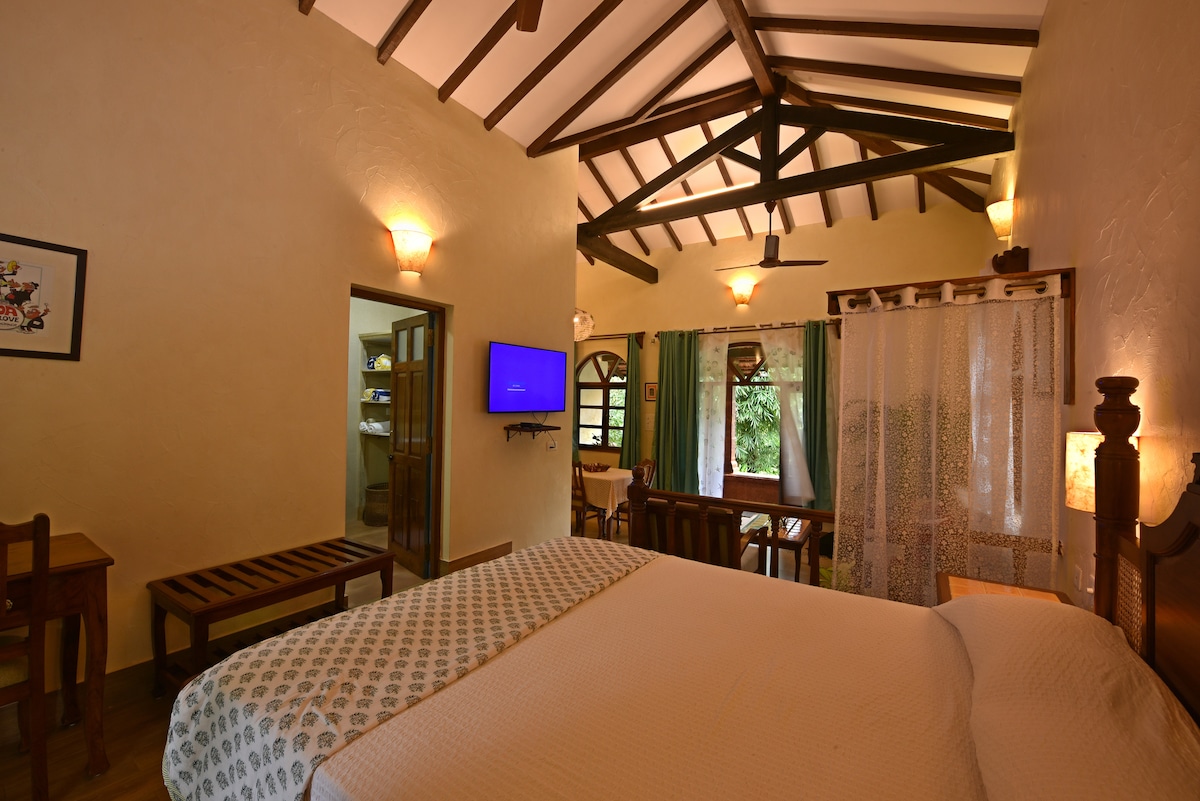 Un cottage calme et naturel niché sur une route de village paisible à seulement 3 km de la plage de Majorda. Bienvenue à Oma Koti Cottage, un paisible chalet d'une chambre niché sur une grande propriété remplie d'arbres. Entouré de cocotiers, de chikoo, de goyaviers et de manguiers, ce refuge confortable offre une tranquillité totale, de l'air frais et la sensation de vivre dans votre propre forêt privée. Parfait pour 2 personnes, le chalet allie simplicité, confort et beaucoup d'espace extérieur.