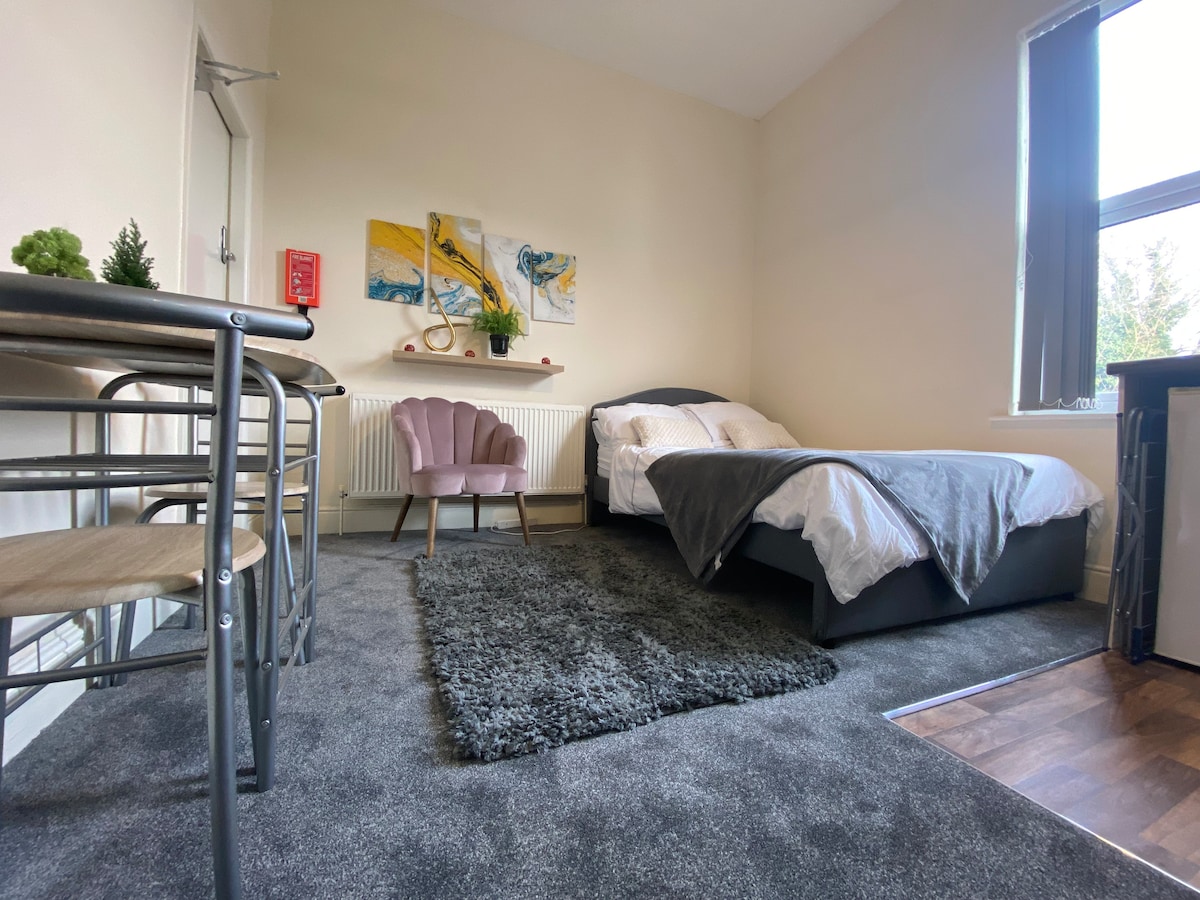 Profitez de notre studio au rez-de-chaussée, entrée privée, salle de bain, kitchenette avec réfrigérateur-congélateur, micro-ondes, lit double, télévision murale. Chargeur VE PAYG - Idéal pour les voyageurs d'affaires et les couples à la recherche d'une pause détente. Situé sur une avenue calme bordée d'arbres. À quelques minutes des bars et restaurants de Chatsworth Road. À proximité du Peak District, de Chatsworth House, de Buxton, de Bakewell et de Matlock, accès des voyageurs via une serrure à clé codée. Niché près de la piste cyclable de Hipper Valley pour une retraite paisible.
