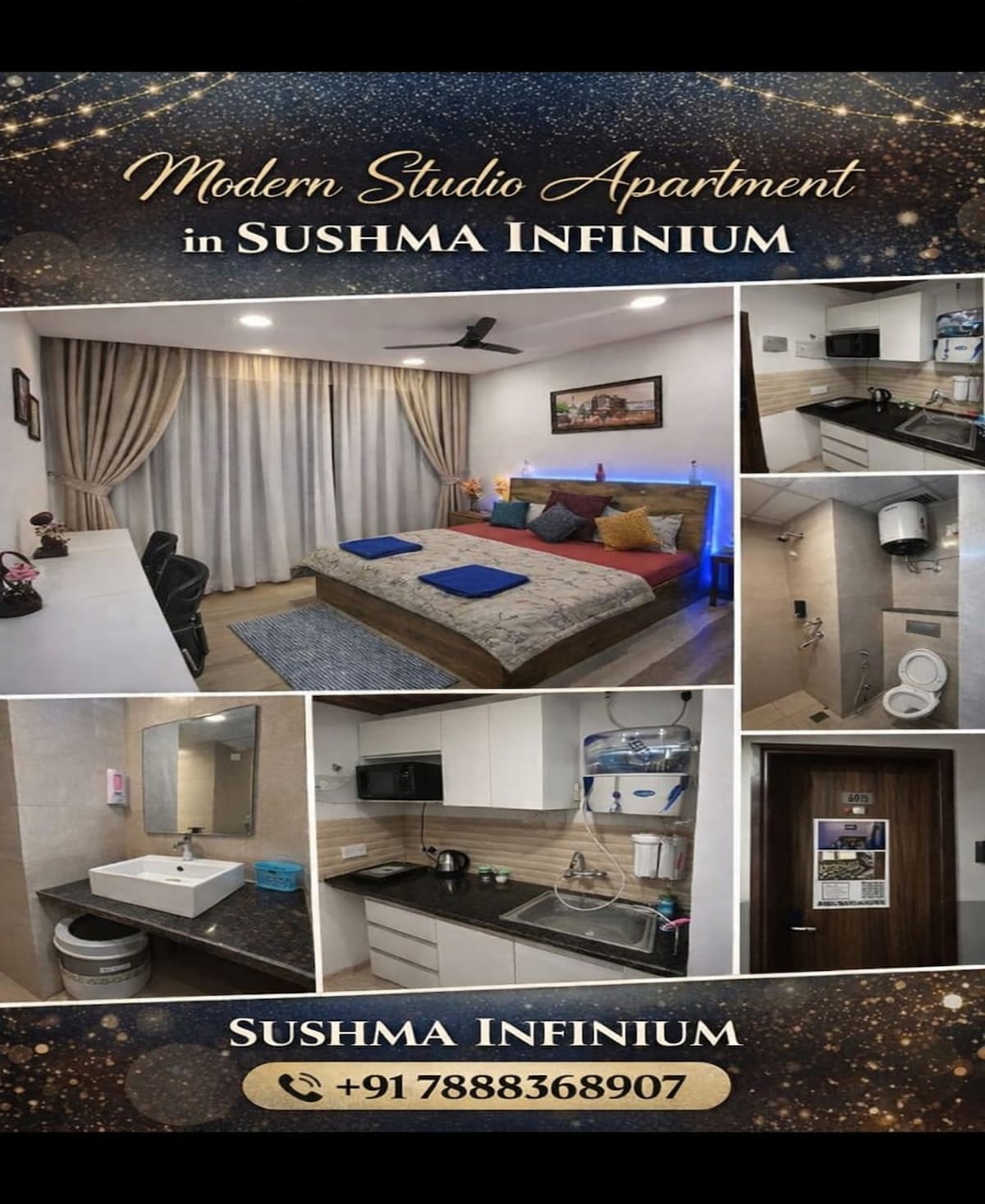 Appartement moderne de 3 chambres • Salon spacieux • 3 chambres confortables • Cuisine entièrement équipée • Salles de bain propres et modernes ⭐ LES ÉQUIPEMENTS Les voyageurs ont accès à la piscine, à la salle de sport, au théâtre, aux jeux, au salon et à d'autres équipements comme le tennis de table, le badminton, le golf virtuel, le carrom, le billard, le baby-foot, le hockey sur coussin d'air 🗺️ EMPLACEMENT Située près de l'autoroute Chandigarh–Delhi, la propriété est : • À 10–15 minutes de l'aéroport de Chandigarh • À proximité des centres commerciaux • Invités à un mariage dans la région des trois villes
