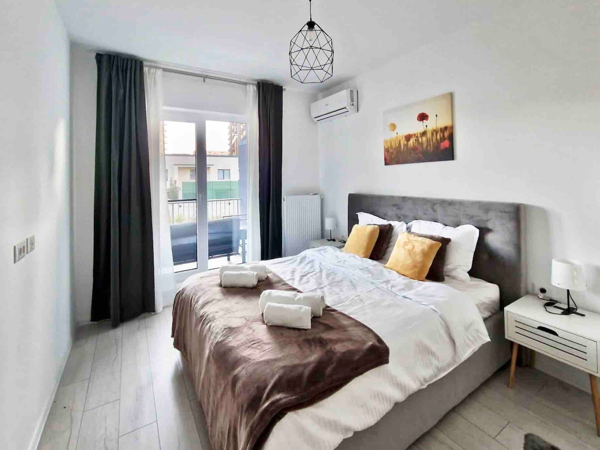 Enjoy this spacious two room & terrace apartment in a brand new complex. Only a short 15min metro ride to Bucharest’s vibrant city centre and Old Town. - Sofa-Bed+ - Huge private terrace - Kids play area - Washing Machine and Tumble Dryer - Superfast WiFi - Smart TV with Netflix - Smart Central Heating - Air Conditioning in ALL rooms - Secure underground parking - Highly secure gated building complex. We’re not new to Airbnb. Check out Andrei’s 90+ reviews of welcoming guests in the UK 🇬🇧
