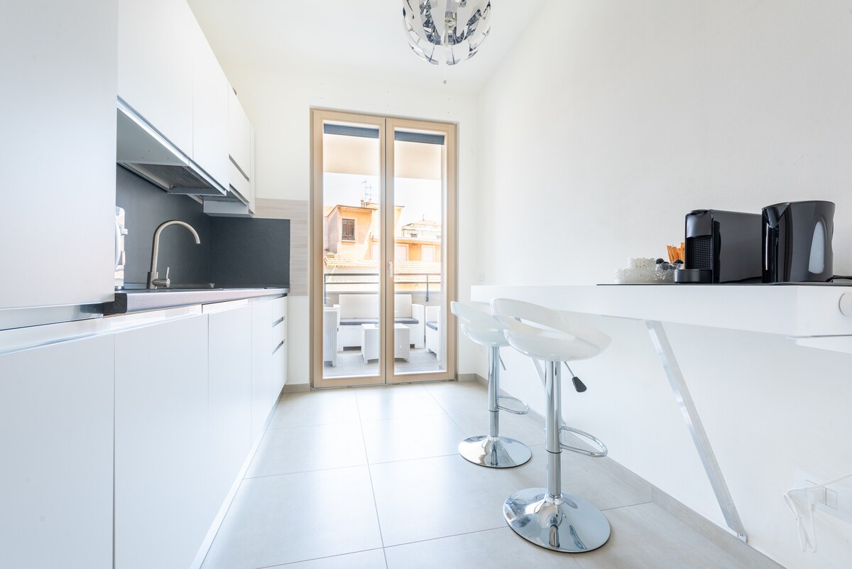 Élégant penthouse très lumineux avec terrasse privée généreuse, situé à 5 minutes à pied de la gare L'appartement est composé de : - grand espace ouvert salon et cuisine, salon avec canapé-lit, smart tv et coin bureau et WI-FI - grande chambre double avec lit King Size, armoire apparente et coffre-fort - salle de bain en marbre avec douche deluxe - grande terrasse avec espace détente Situé dans un quartier stratégique de 5 minutes à pied de la gare de Milan et Malpensa. APPARTEMENT CONSTRUIT EN 2023