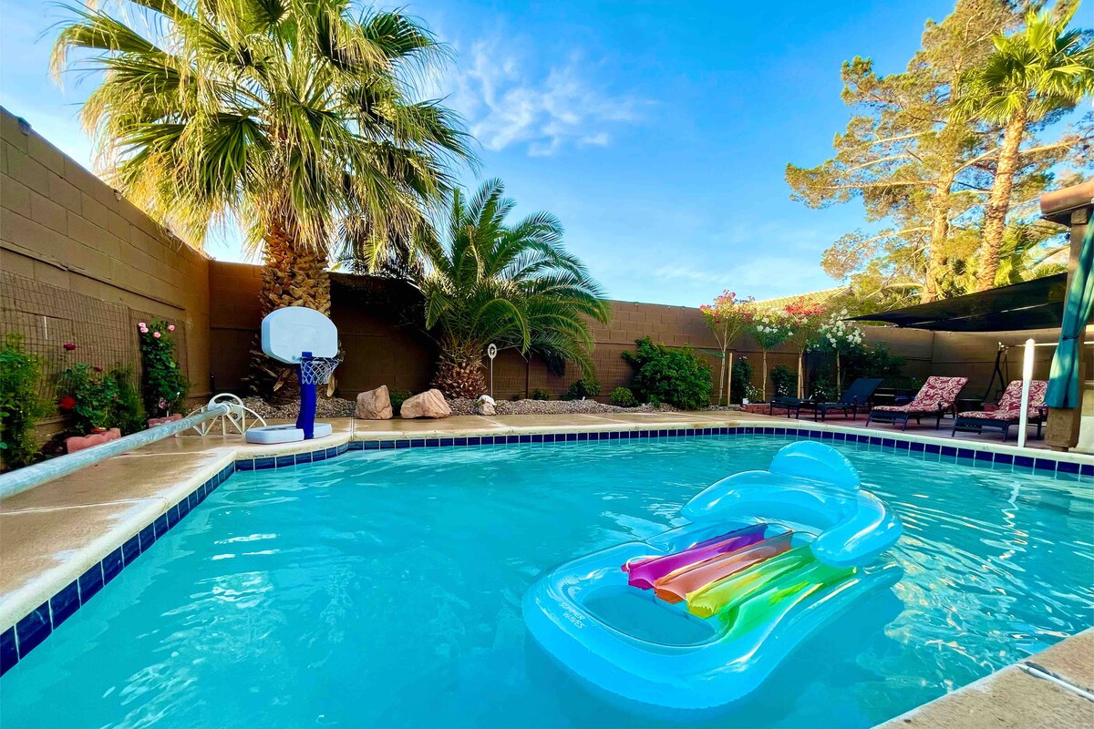 Maison de divertissement ultime ! IMMENSE piscine intérieure avec mur de télévision 4 65"avec son surround, volley-ball et basket-ball Salle de cinéma, table de billard, ping-pong, table de beer pong, arcade de basket, air hockey, sur un immense terrain de 1 acre. 6 chambres, 8 lits, plus 2 lits futon, 4 salles de bain complètes et 2 demi-salles de bain Accès rapide en voiture à n'importe quel endroit où vous devez vous rendre ; à 5 miles de l'aéroport, à environ un mile de Las Vegas Blvd, à environ 15 minutes de la plupart des emplacements du Strip La piscine peut être chauffée pour un supplément de 59 $ par jour