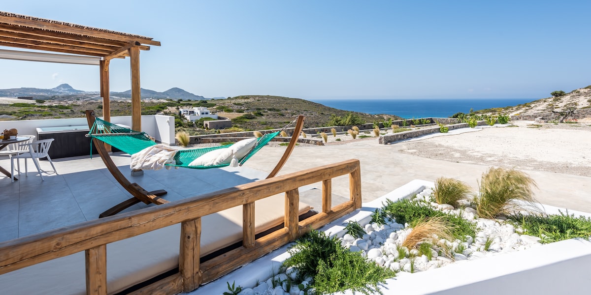 Appartement de ferme privé avec de hauts plafonds, une chambre et une salle de bain. Coin cuisine spécial, préparation du petit-déjeuner et des plats froids. 2 balcons (40 m2 au total), avec vue panoramique sur le port en face et la mer de Sarakiniko derrière (le paysage lunaire est à seulement 15 minutes à pied). Distances : à 4 minutes du port et à 7 minutes de l'aéroport en voiture. Plaka : 5 km, Pollonia : 7 km, Fyriplaka-Tsigrado en 15 minutes. Jardin récemment aménagé, environnement naturel avec intimité et tranquillité.