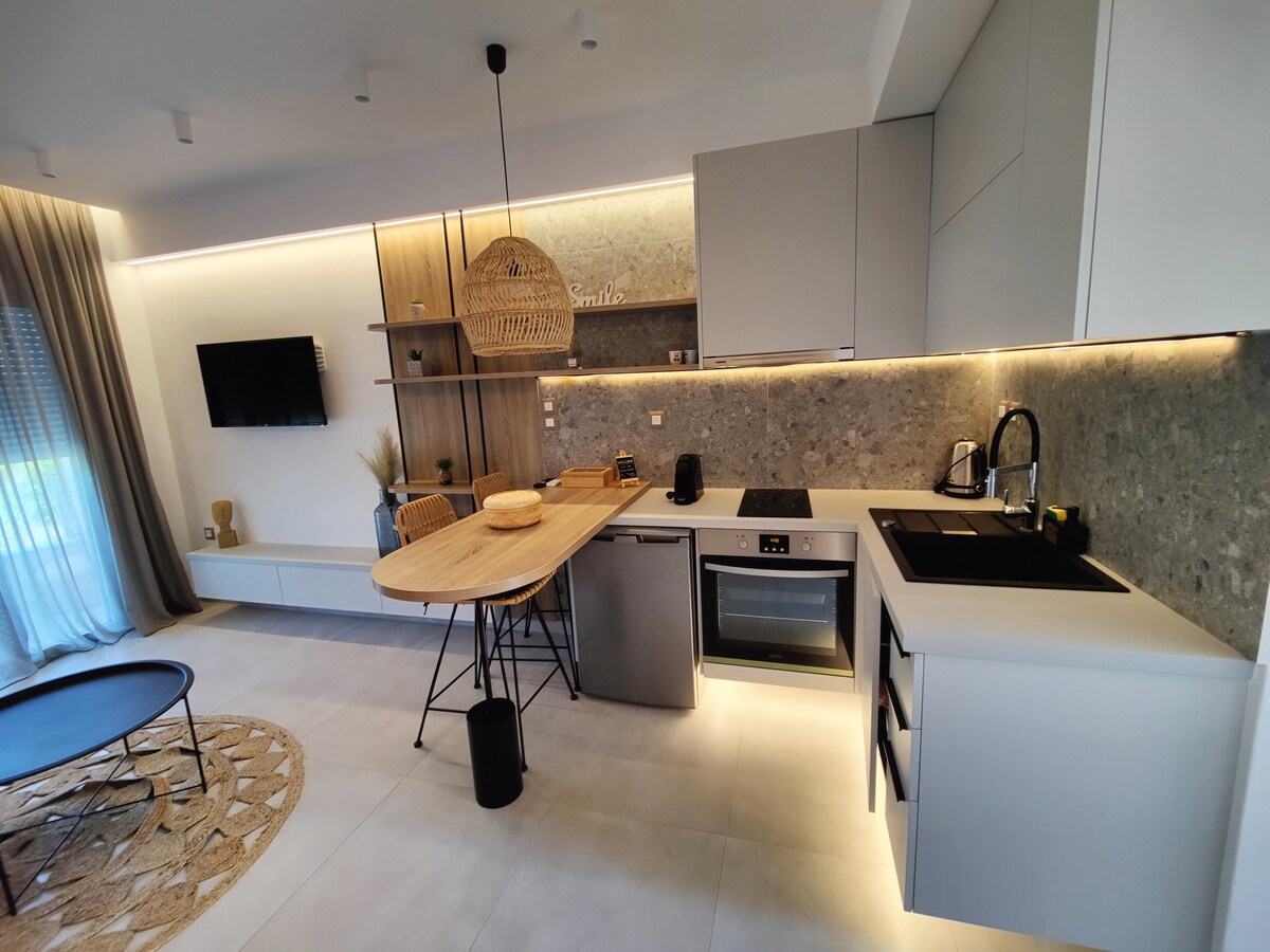 Right in front of the beach, this independent apartment is ideal for relaxation and rest. The apartment is equipped with all the necessities for your stay (fridge, counter top oven and kitchenware). Internet access (WiFi) and a smart TV with satellite and local channels (plus NETFLIX and Prime video apps to use with your account) are also installed. In walking distance is the center of Makri Gialos. There you can find shops, supermarkets, bars, coffee shops and restaurants.