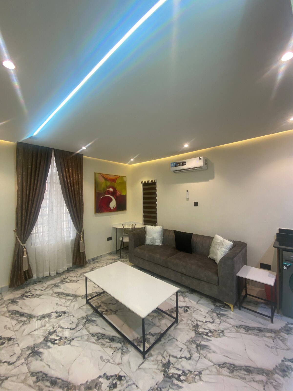 Il s'agit d'un appartement de luxe d'une chambre avec salle de bains au cœur de Lekki Phase 1 avec des toilettes invités. L'appartement est à proximité immédiate de toutes les commodités et de tous les commerces. Il dispose d'une cuisine entièrement équipée avec des accessoires et des ustensiles complets, un lave-linge, une connexion Wi-Fi haut débit, toutes les téléviseurs sont intelligents ; vous pouvez regarder Netflix, YouTube, DSTV, etc. C'est une maison loin de chez vous et nous nous efforçons de faire en sorte que tous nos voyageurs profitent de leur séjour et vivent une expérience inoubliable à des prix abordables.
