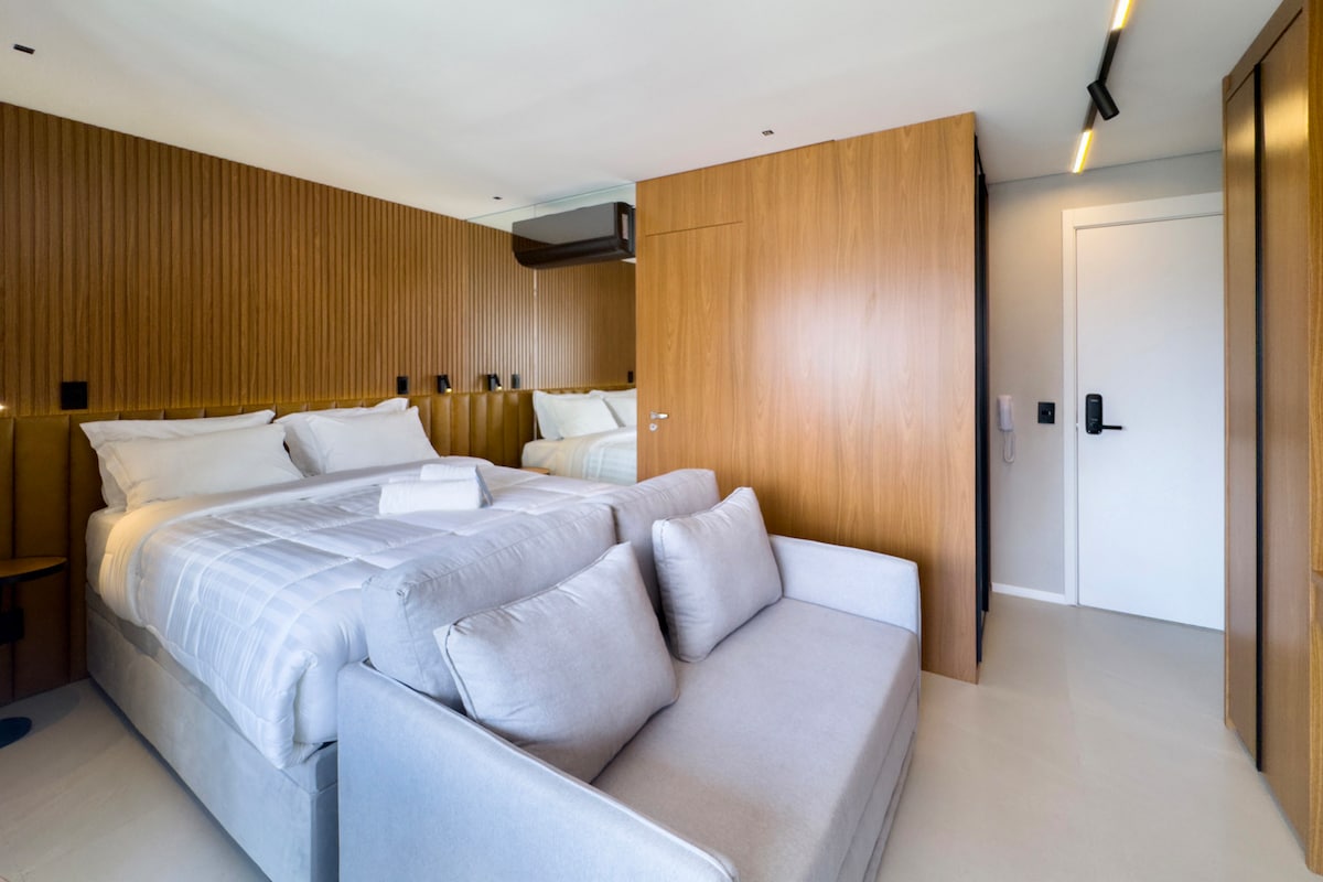 Informations rapides : - lit queen - Garage avec voiturier - Secador - Machine à café et capsules - Support de cuisine (pas de cuisinière) - 7e étage - Wi-Fi. - Micro-onde Proximidades : - Faria Lima 100 m - Parc du Peuple à 500 mètres - Cafétéria à 100 m - Centre commercial à 600 m - Plusieurs bars et restaurants Bienvenue dans le luxe à Itaim Bibi ! L'appartement est situé à l'intérieur de l'Hotel Transamerica Executive au 7e étage. Nous travaillons avec du linge de maison, des serviettes et des équipements de bienvenue de haute qualité. R. Pedroso Alvarenga, 1256 - Itaim Bibi