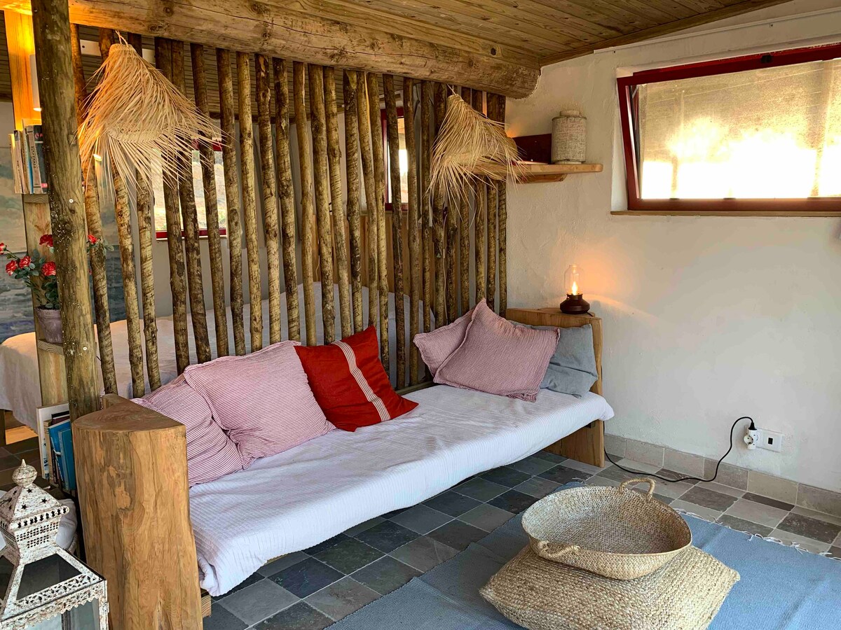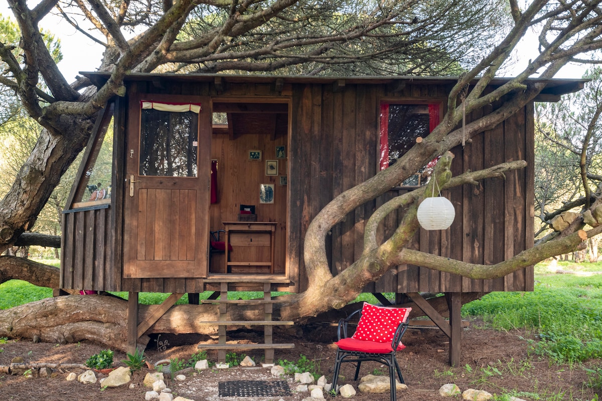 Belle cabane en bois construite par le propriétaire, située au sommet d'un pin qui a poussé horizontalement. À seulement 5 minutes à pied de la mer qui borde la propriété. Beaucoup d'intimité autour de la maison et un transat pour se prélasser. La terre fait partie du parc naturel, offre une vue imprenable sur l'océan et des couchers de soleil incroyables. La cabane est décorée avec des détails faits à la main, dispose d'un lit double confortable, d'un réfrigérateur et d'une cuisinière à gaz. Nous avons récemment installé de l'eau chaude dans la douche extérieure !