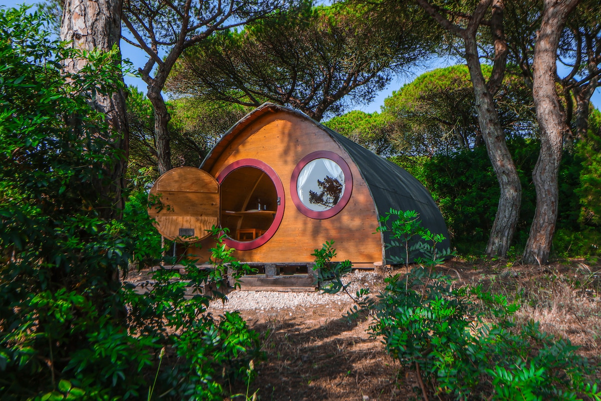 Ce pod en bois confortable est l'endroit idéal pour une escapade romantique et/ou une escapade en ville. Avec de belles plages, des sentiers côtiers sans fin et de superbes couchers de soleil sur l'océan Atlantique, le pod écologique vous invite à vous détendre, à explorer et à profiter d'une nuit paisible sous les étoiles, le tout à seulement 45 km de Lisbonne ! Il y a un pod similaire à celui-ci dans la propriété, donc, si ce Hobbit Pod est déjà réservé, vérifiez le « Peaceful, Romantic Hobbit Pod » également des mêmes hôtes et dans la même propriété.