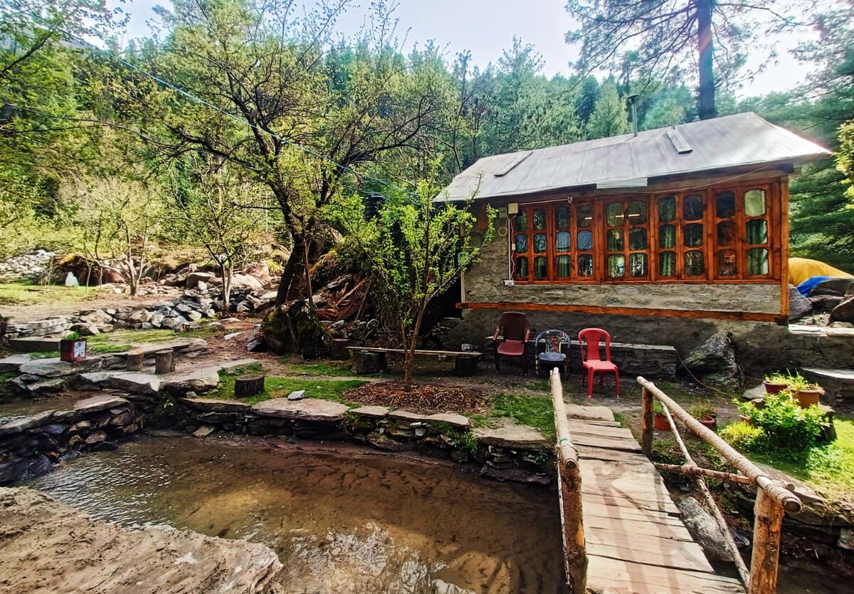 Bienvenue dans mon chalet situé sur les genoux de la vallée de Kullu. Vous regardez une chambre simple avec une salle de bain attenante, un salon spacieux avec un canapé-lit, une cuisine ouverte grandeur nature (*entièrement équipée) et un balcon pour oublier votre vie bien remplie et la rendre sereine dans les collines ! * WIFI gratuit (powerbackup) * Lave-linge entièrement automatique *Appartement entièrement meublé * Emplacement central * Studio de yoga *Chauffages et geysers disponibles * jardin personnel pour se détendre