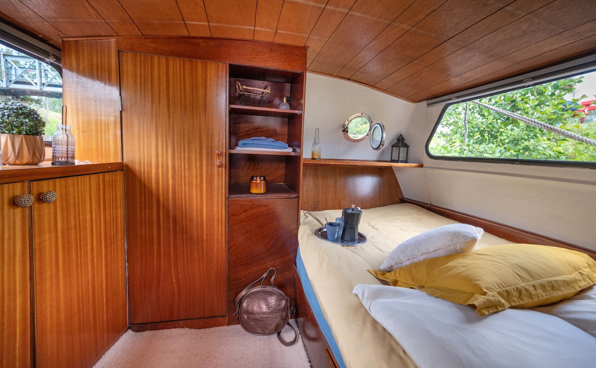 Profitez du cadre charmant de ce logement romantique en pleine nature,au bout du ponton pour plus de tranquilité. C'est un bateau a quai avec 5 couchages dont 2 en pointe,avec une petite kitchenette possédant frigo ,micro onde,mini plancha, cafetière dosettes, bouilloire, vaisselle,un point d'eau (froide) pour faire la vaisselle ou ce laver les mains, radiateur etc ..