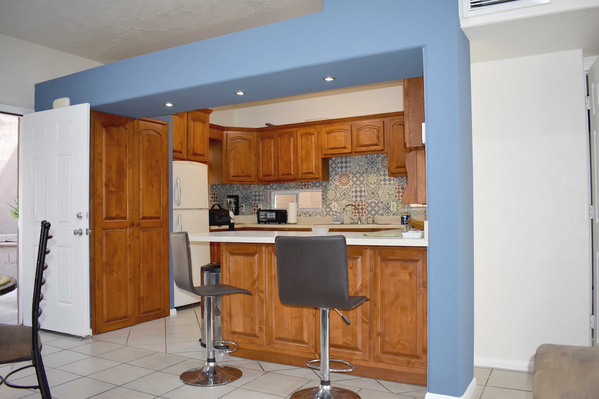 La casita est située entre le terrain de golf et le village de Tubac. La casita dispose d'une chambre privée et d'une salle de bain avec entrée extérieure. La cour privée dispose d'un porche couvert et d'une cuisine extérieure. À l'intérieur se trouvent un lit king size, une table, des chaises, un réfrigérateur, un micro-ondes, une cafetière. Les équipements comprennent le WI-FI, la télévision locale, le paon. Réductions pour séjours à la semaine et pour séjours longue durée. Arrivée anticipée/départ tardif généralement disponibles... Veuillez ignorer les 13 photos à la fin. Elles sont pour mon annonce de petite maison au cas où vous seriez intéressé.