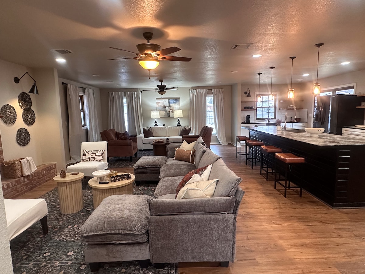 Évadez-vous dans le comté d'Osage, où le ciel continue pour toujours et où les habitants vous traitent comme un membre de leur famille. Cette ferme des années 50 a été récemment mise à jour dans une ambiance de ferme légère et aérée et terminée avec tous les luxes modernes. Reposez-vous d'une longue journée à explorer la prairie d'Osage et sirotez du vin dans le salon tranquille ou jouez à des jeux de société sur la grande table de dortoir. Avec tous les équipements d'un chez-soi, vous voudrez sûrement retourner dans notre petit coin du cœur.