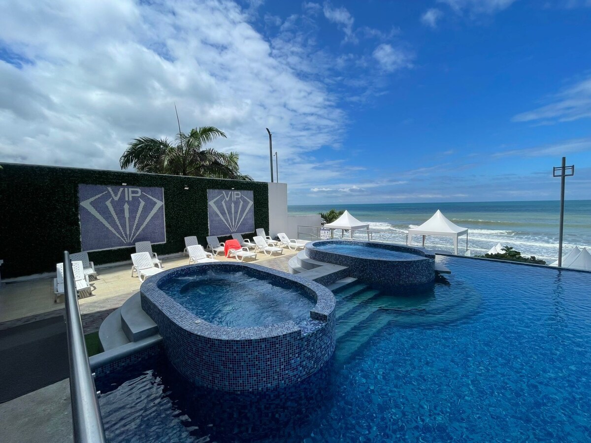 Departamento de lujo frente al mar, perfecto para parejas, familias o grupos que buscan relajarse en un entorno exclusivo junto al mar. Está completamente amueblado, equipado con electrodomésticos de alta gama. Cuenta con un amplio balcón con tina de hidromasaje y vista directa a la playa. Tiene dos habitaciones: una con cama King size y otra con dos literas y una cama adicional. Incluye acceso a tres elevadores y un espacio en el estacionamiento privado.