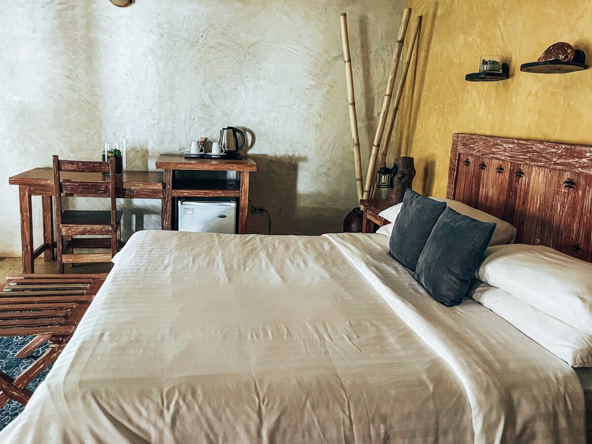 Cette chambre pour 2 personnes est merveilleuse pour le calme et de la détente. Avec une belle décoration rustique, un lit King Size confortable, une climatisation, de l'eau chaude/froide, un mini-réfrigérateur, une télévision connectée (prête pour votre connexion en streaming), cette chambre vous permettra de laver le sel et le sable et de vous détendre après des journées amusantes surfant et allongée sur la plage. * Voyageur supplémentaire, disponible pour les enfants jusqu'à 12 ans.* *Une taxe de 10% sera perçue séparément car Airbnb ne perçoit pas de taxe au nom de l'hôte.*