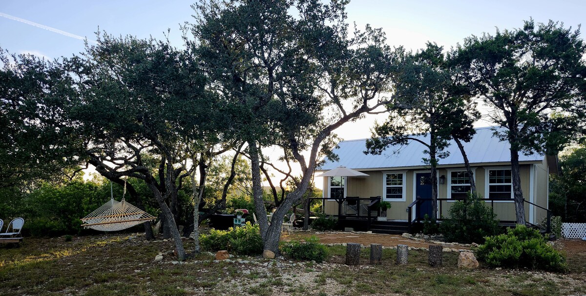 Notre cabane 5 étoiles est encore mieux qu'avant ! Profitez de journées tranquilles, de couchers de soleil spectaculaires et de nuits étoilées depuis le porche enveloppant. Explorez les vignobles, les restaurants, les magasins et les parcs d'État à proximité pour les loisirs et l'histoire. La cabane Sunset est construite en cèdre et en pin aromatiques. La cabane est confortablement meublée avec une cuisine complète, un lit Queen Size, un coin salon et une connexion Wi-Fi. Délectez-vous de notre eau de pluie pure et filtrée et de notre faune abondante. Situé à une heure d'Austin ou de San Antonio.