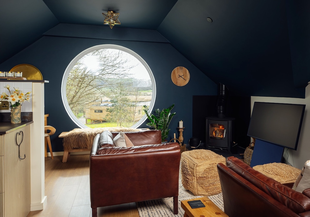 Chalet romantique du Pembrokeshire sur un magnifique terrain de 3 acres avec sauna, étang de baignade naturel (en fonction de la pluie), salle de jeux et kayaks. Promenades sur les collines à votre porte, superbes plages et promenades sur les falaises à proximité. Observez les étoiles depuis un lit King Size confortable. Blottissez-vous près d'un poêle à bois (bois gratuit). Grande salle de bain avec baignoire, douche et chauffage au sol. Cuisine bien équipée avec machine à café. Coin salon extérieur couvert avec foyer et barbecue. Internet fibre, télévision connectée (Netflix, etc.). 2 chiens bien dressés sont les bienvenus.