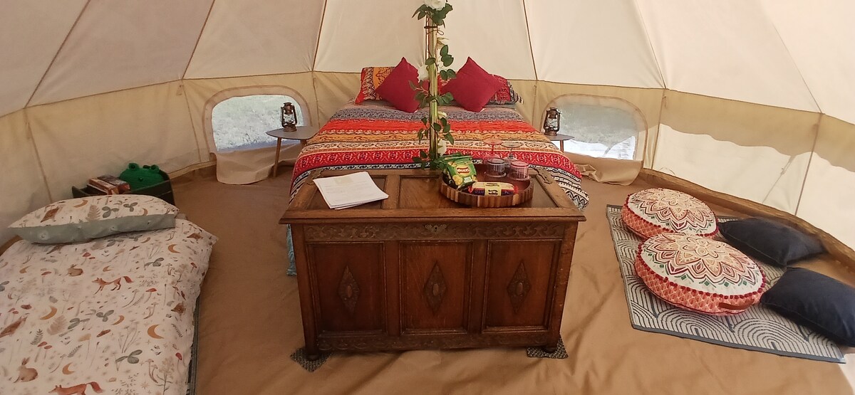 Glamping privé de luxe au pied du verger sous l'ancien hêtre. Cette yourte spacieuse est isolée pour vous garder au chaud pendant ces nuits fraîches dispose d'un lit double confortable avec une literie et des serviettes de qualité, d'un canapé et d'un poêle à bois, d'un banc de pique-nique et d'un foyer. Cuisine privée avec cuisinière de camping et plaque de cuisson. Bouilloire écologique et douche chaude pour votre propre usage. Vous serez dans un endroit isolé mais en bordure de notre petite exploitation et de notre camping entouré d'animaux sympathiques.