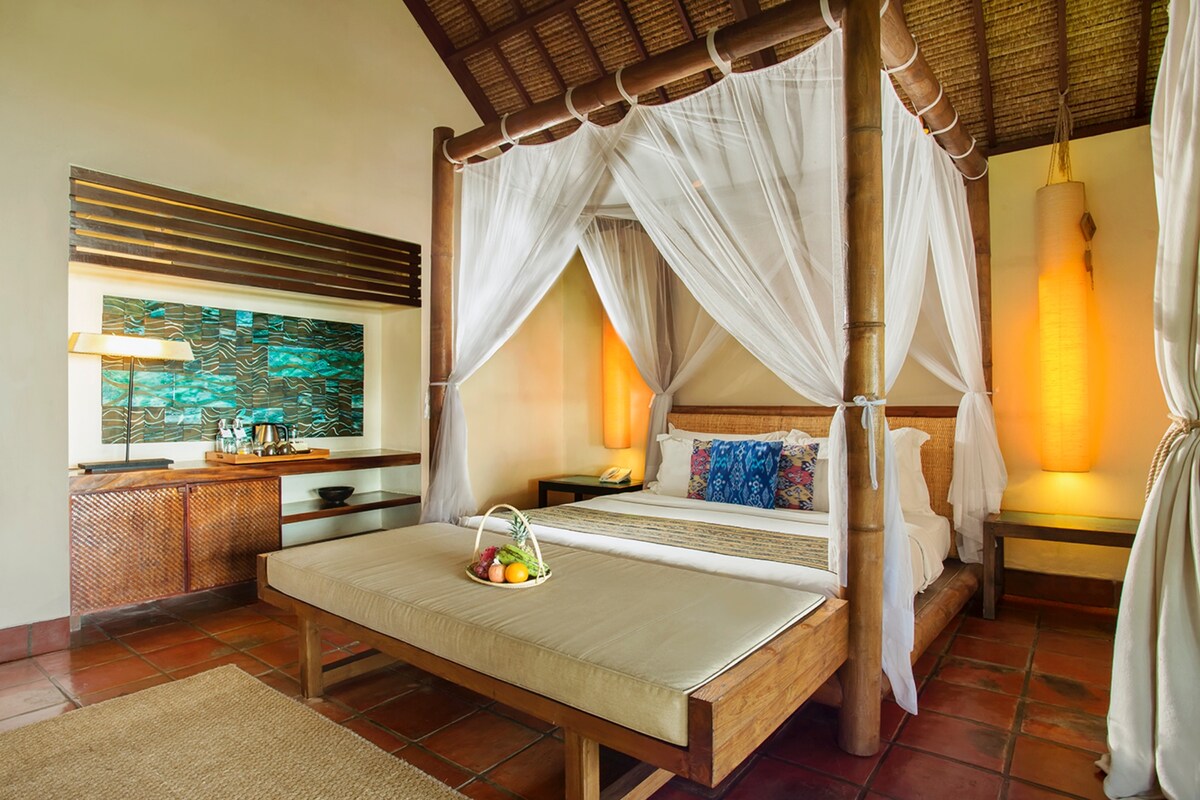 Situé à 100 mètres de la meilleure plage de l'île pour la plongée avec tuba et la baignade. Le Lumbung est une villa en bois de noix de coco au caractère brillant. Restaurée et modernisée pour offrir le luxe et le confort d'aujourd'hui, avec un mélange unique de patrimoine et de commodité moderne.