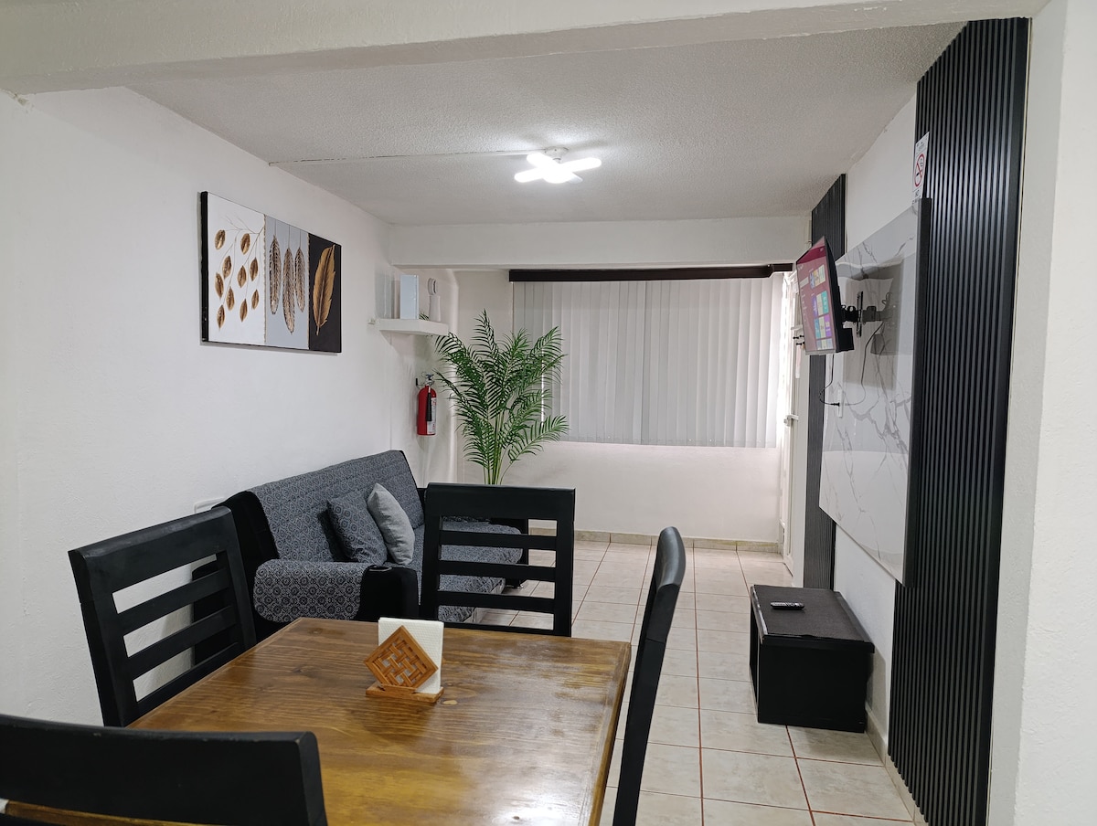 Excellent emplacement, moderne, confortable et spacieux. Idéal pour les familles, les couples, les voyages d'affaires, les étudiants et le bureau à domicile. WiFi et Netflix, parking, 2 chambres, 2 1/2 salles de bains, cuisine équipée, salon-salle à manger et climatiseurs. À 1 pâté de maisons du centre commercial El Dorado et Oxxo, à quelques minutes de l'Av. V. Carranza, du centre historique, de la zone universitaire. À 3 min. Blvd. Río Santiago et à 10 pâtés de maisons de Blvd. Salvador Nava, principales voies rapides pour se rendre à la zone industrielle, à l'aéroport et à la gare routière.