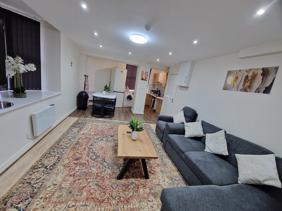 Grand studio en sous-sol, situé dans la zone de conservation calme de Prestwich, accès au parking sur une allée privée. L'appartement est à 15 minutes à pied de la station de métro de Prestwich. Il y a aussi des bars, des restaurants et des supermarchés à 10 minutes à pied. Le Metrolink dessert la plupart des parties du Grand Manchester, y compris l'aéroport et les terrains de Manchester United/City et la Co-op Live Arena. Nous sommes situés à 15 minutes en voiture du centre-ville de Manchester et à 5 minutes en voiture de la M60/jonction 17.