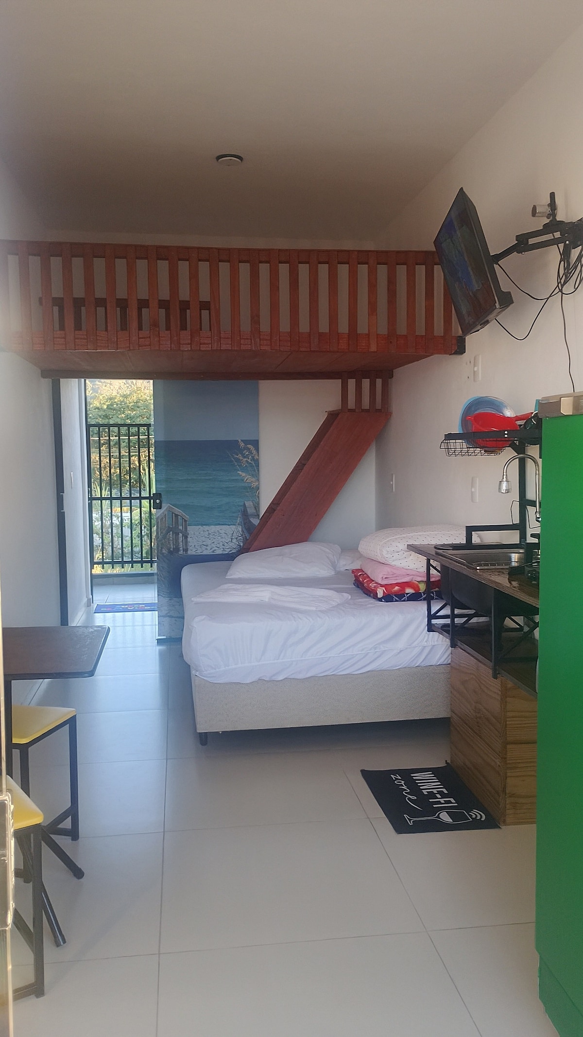 Loft situé dans un endroit calme à seulement 200 mètres du parc Beto Carrero et à 500 mètres des plages. - Économisez sur le parking, nous avons un garage ; - Mezanino peut accueillir confortablement jusqu'à trois personnes ; De la porte, vous pouvez déjà voir le célèbre « Star montain » ; - Surfez dans la rue et traversez l'avenue, vous allez et retournez tranquillement au parc ; - Dans la rue, vous aurez accès aux belles plages de notre ville. Pratique et fonctionnel avec ce dont vous avez besoin.
