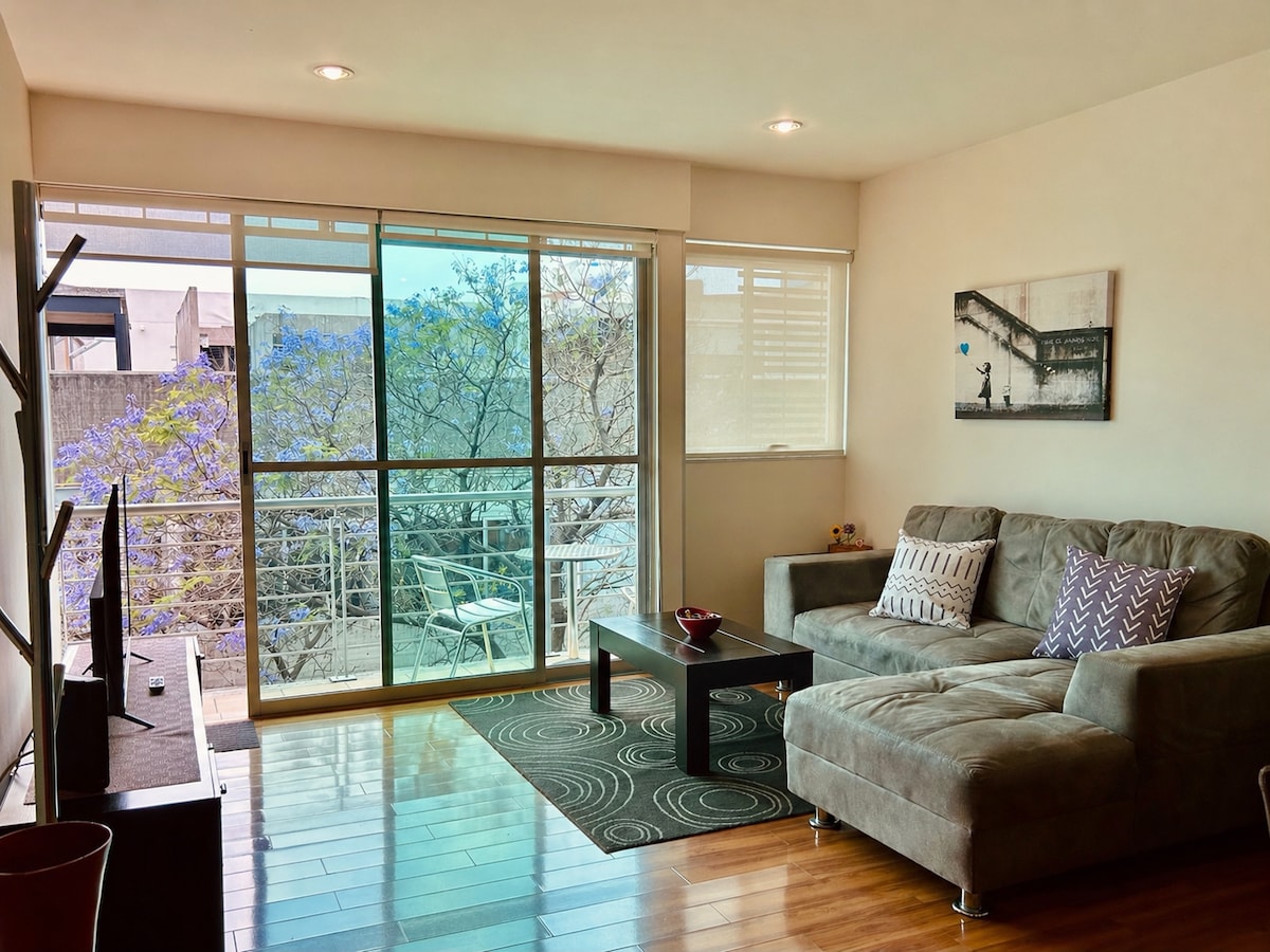 Appartement lumineux au 7e étage (dernier étage), avec balcon et vue sur la ville et le Río Becerra–Viaducto Miguel Alemán. Il dispose de 2 chambres avec des placards spacieux, d'un salon et d'un coin repas, d'une cuisine équipée, d'une salle de bain et de fenêtres du sol au plafond. Téléviseurs intelligents (50" et 24") avec Netflix, Prime et YouTube (les voyageurs se connectent à leurs propres comptes). Comprend Alexa, un réfrigérateur, un micro-ondes et une cafetière. L'accès piétonnier au bâtiment a environ 10 marches. Idéal pour un séjour confortable et bien desservi.