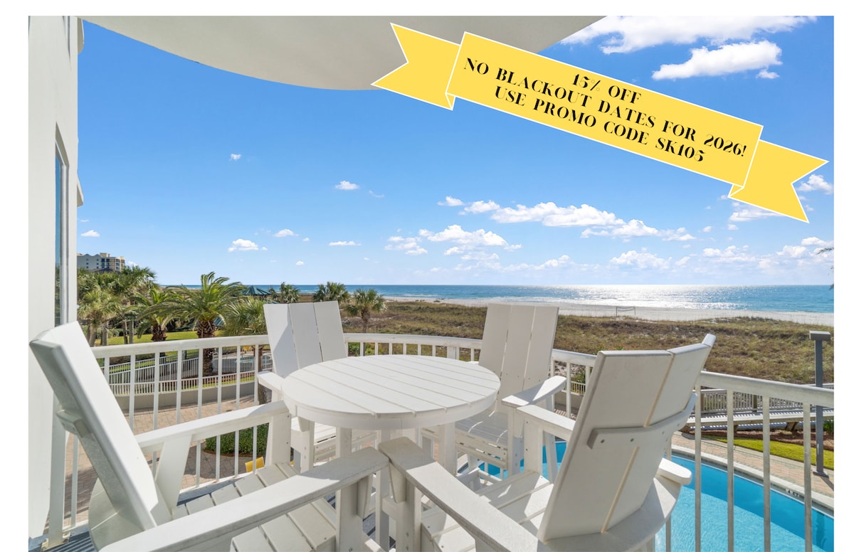 RENSEIGNEZ-VOUS sur le taux de RÉDUCTION pour les séjours mensuels en janvier et février 2026. NE VOUS BATTEZ PAS CONTRE LA FOULE pour avoir de la place sur la plage ! Détendez-vous dans notre confortable 4e étage en bord de mer « Slice of Paradise » avec plage privée. Le balcon offre une vue imprenable et magnifique sur le golfe et le magnifique sable blanc de Perdido Key. Profitez du soleil en vous détendant sur le balcon et comptez les dauphins tout en étant bercés par le son des vagues et la brise de l'air salé. Récemment MIS À JOUR - Nouvelles photos à venir !