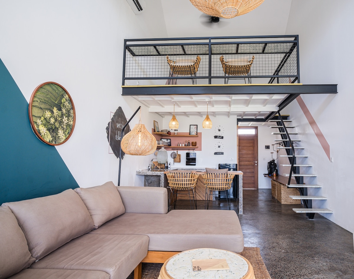 À seulement 2 minutes à pied de la plage de Perenenan, cet appartement lumineux et écologique d'une chambre est le point de départ idéal pour les surfeurs qui veulent rester près des vagues, mais loin de l'agitation de Canggu. Profitez d'un salon spacieux et ouvert, d'une chambre confortable en mezzanine et d'un balcon privé pour vous détendre après vos séances de surf. Avec une bonne ventilation et beaucoup de lumière naturelle, c'est un endroit idéal pour se ressourcer entre les marées.