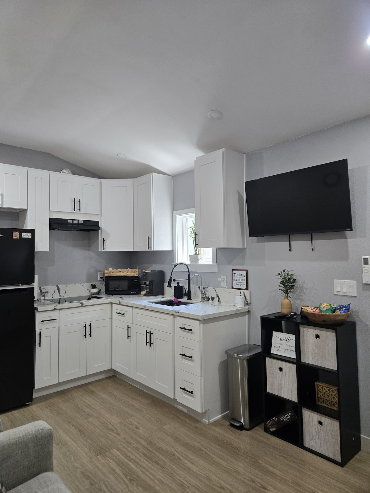 This suite has a kitchenette equipped with a microwave, w/d, mini fridge, mini freezer and small appliances to meet your needs. The living room is furnished with a 50” tv and a mid-century style sofa that folds into a bed right next to a stylish bar height table with stools. The bedroom has access to its own enclosed patio area and en suite bathroom with a shower (no tub). Only 25 minutes away from Temecula wineries, outlets in LE and the nearest shopping center is just 5 minutes away.