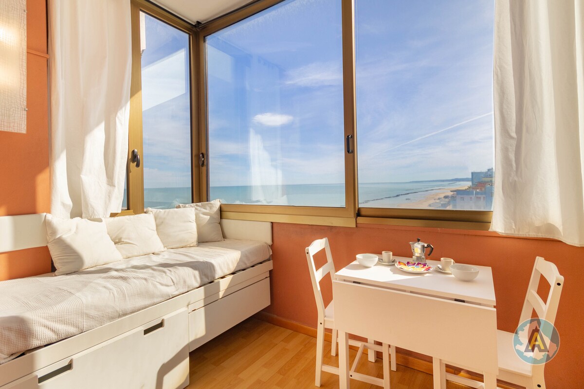 Appartement en bord de mer finement meublé, avec parquet, composé d’un salon avec canapé-lit, d’une kitchenette avec lave-vaisselle, d’une chambre double, d’une chambre avec lits superposés, d’une salle de bain avec douche et machine à laver, de deux terrasses avec vue sur la mer (une avec lavoir). Toutes les pièces sont climatisées. Service de conciergerie et parking en copropriété non attribué, accessible par télécommande (à l’intérieur de la clôture de la copropriété, vous pouvez vous garer, si des places sont disponibles).