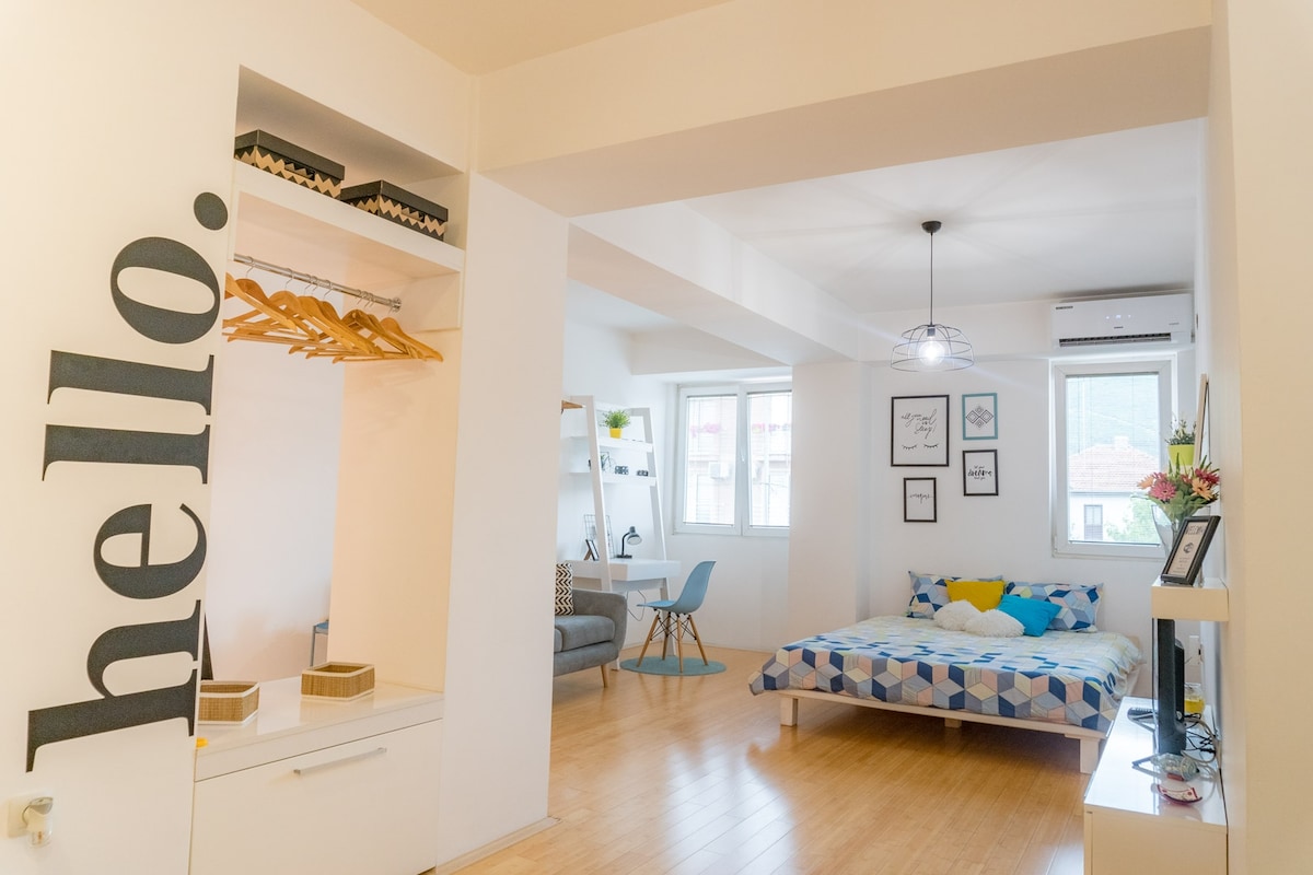 Studio élégant idéal pour les couples, les amis ou les voyageurs en solo. Salle de bain entièrement rénovée en janvier 2026. Pratique pour les séjours plus longs également : connexion Internet rapide et stable par fibre optique (téléchargement et téléversement 80/80 mbps) pour ceux qui travaillent à distance. Laveuse/sécheuse dans le logement. Entièrement équipé, situé au premier étage (avec ascenseur) dans un nouveau bâtiment avec parking public gratuit. Superbe vue sur la montagne. Accès à pied au lac, aux sentiers de randonnée jusqu'aux montagnes voisines et à la vieille ville d'Ohrid.