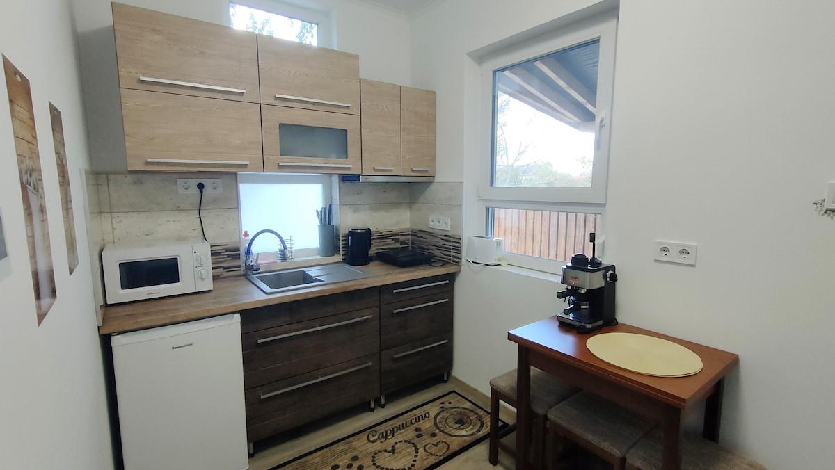Profitez d'une expérience élégante et vintage au cœur de Veresegyház, mais dans une rue calme. L'appartement, joliment meublé dans une ferme rustique, peut accueillir 5 personnes (3 lits simples, 1 canapé-lit). La détente de nos voyageurs est assurée par une cuisine bien équipée, une salle de bain, des toilettes séparées, un patio couvert, un patio, un barbecue.