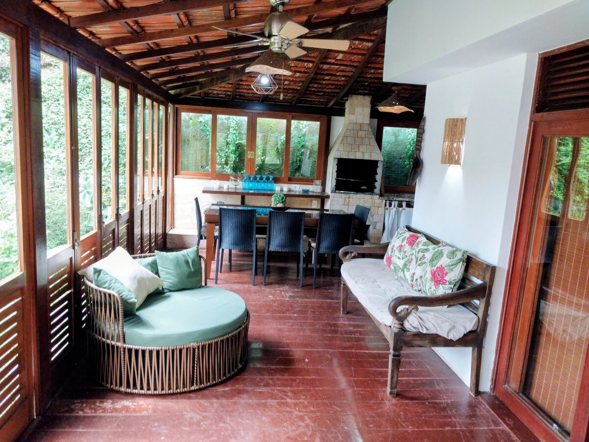 Maison spacieuse et confortable au milieu de la forêt atlantique, avec ruisseau, vue sur les montagnes et super calme. Parfait pour les moments en famille et la reconnexion. À 10 minutes du centre d'Itaipava et facile d'accès. L'espace La maison dispose d'une cheminée intérieure et extérieure, la suite dispose d'un lit queen size, d'une télévision de 50 pouces, de la climatisation et du chauffage. Les hamacs, la pergola, le barbecue et la douche rendent l'espace de loisirs super agréable.