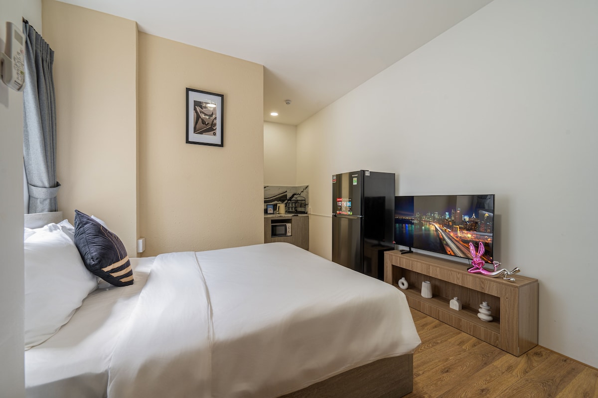 Gâtez-vous dans le luxe en explorant l'incroyable SG !Tout cet appartement de 1 chambre sera votre retraite de la ville toujours animée de Hô Chi Minh-Ville,mon appartement se trouve bien au-dessus de l'agitation de la ville. Vous pourrez vous détendre près de la piscine à débordement sur le toit ou vous entraîner dans la salle de sport bien équipée. Les deux sont gratuits ! Sortez, et vous serez au centre de tout :restaurants, cafés, cuisine de rue, mart et vie nocturne. Les attractions touristiques du district 1 sont à seulement 3 minutes en voiture ou à quelques pas de l'autre côté de la rivière SG.