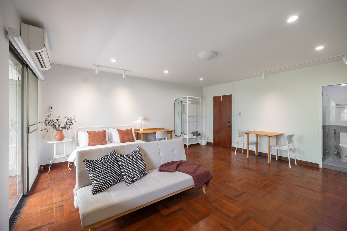 Un appartement entier spacieux avec salle de bain privée, kitchenette, séjour/salle à manger, 1 chambre avec espace de travail désigné et balcon. Profitez des larges fenêtres pour une vue imprenable et beaucoup de lumière du soleil, augmentant l'aération pour un séjour plus relaxant. Profitez de toutes les commodités de la vie urbaine, notamment : - À 5 min de BTS Asok, MRT Sukhumvit - à 5 min de Terminal 21, Emporium/Emquartier et du parc Benjasiri - À 1 min du magasin 7-11 - Beaucoup de cuisine de rue, café et taxis/vélos