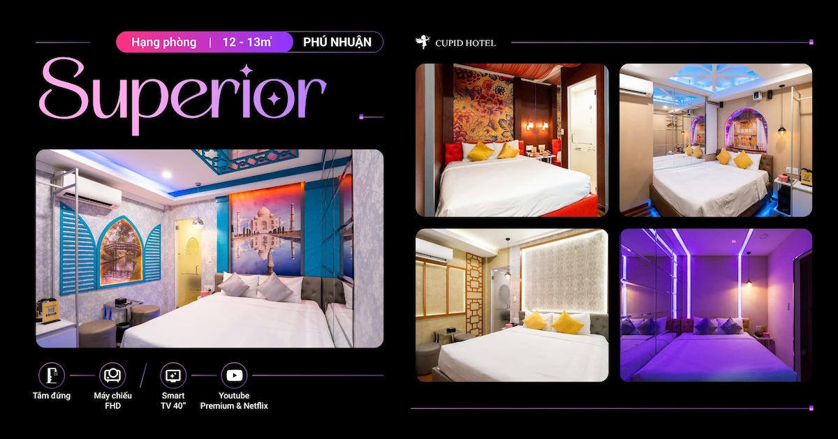 Mỗi phòng tại Cupid được thiết kế theo một chủ đề khác nhau – từ ngọt ngào, quyến rũ đến huyền bí, độc đáo – giúp bạn thoải mái chọn lựa theo sở thích của mình. Ngoài ra, khách sạn còn trang bị ghế tantra (tùy hạng phòng), và cả rạp chiếu phim mini ngay trong phòng – tất cả tạo nên một trải nghiệm đậm chất “chill”, tinh tế và đầy cảm xúc cho các cặp đôi. Và tất nhiên, đội ngũ nhân viên tại đây cũng cực kỳ dễ thương, luôn sẵn sàng hỗ trợ bạn 24/7!